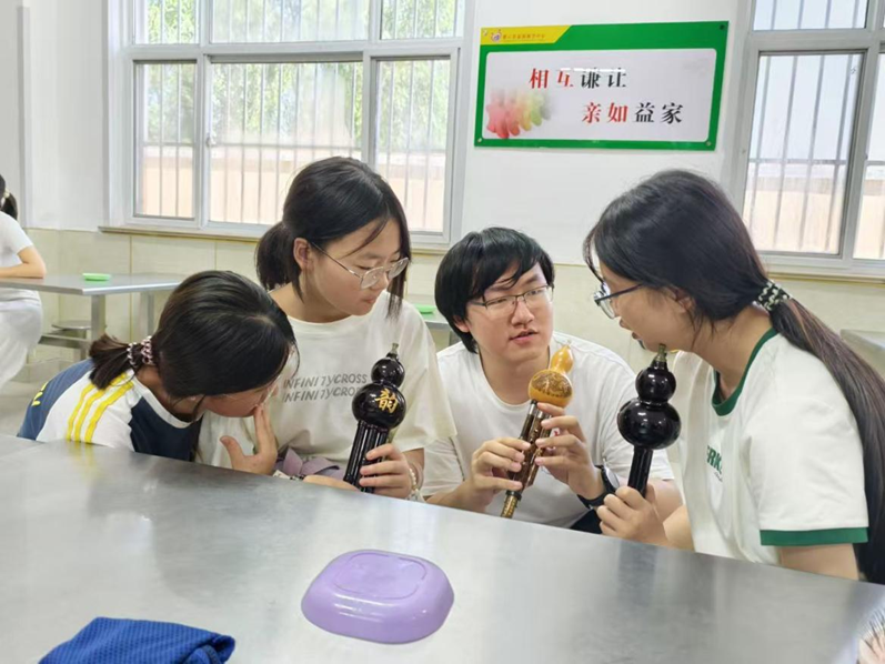 22日,支教团成员吹响了《月光下的凤尾竹》,给学生们带来了一堂音乐课。支教老师引导学生触摸葫芦丝构造,讲解发声原理。通过小组讨论、示范纠错,孩子们逐步掌握葫芦丝演奏技巧。音乐课后,羽翼支教团开展了“职业万花筒”课程。课堂上,抽象的职业认知化作可触可感的彩色卡片。下午烈日下,益海助学中心操场仍充满欢声笑语;投壶、保龄球等项目中师生互动活跃。