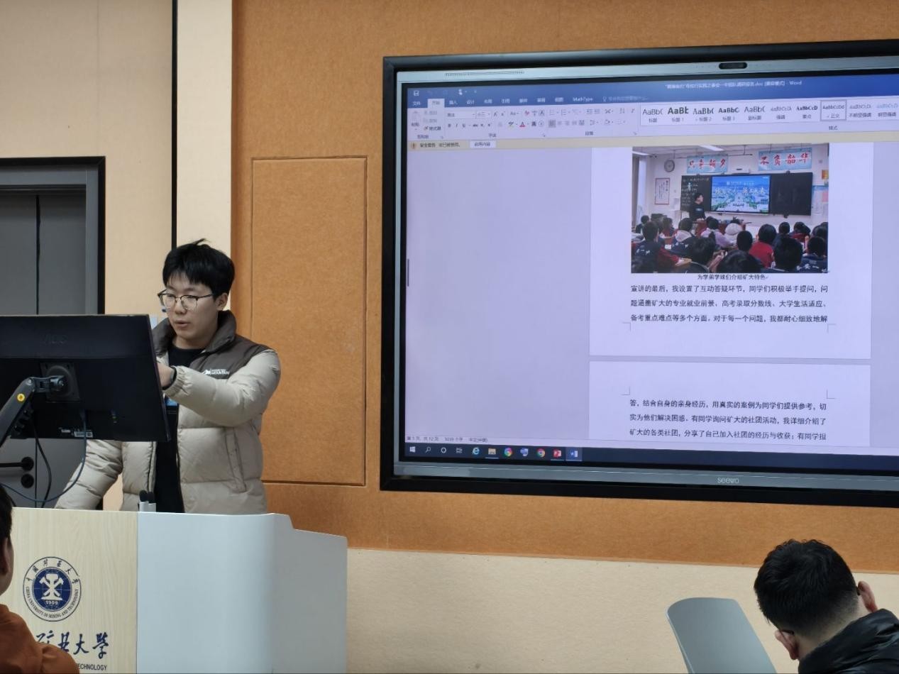活动现场气氛热烈,同学们依次上台分享了寒假实践经历。实践内容涵盖社区服务、返校宣讲、山区支教、红色研学等多个领域。郑景轩同学回到家乡乐亭,在乐亭县李大钊纪念馆开展研学,深化了对革命先烈精神的理解。邓尚轩同学回到了母校泰安一中开展矿大宣讲,分享备考经验、解答升学疑问,搭建起校际沟通桥梁。黎泽宏同学前往湖南省娄底市新化县古台山中心学校支教,教授数学、英语课程并参与农活,以实际行动践行青年担当。